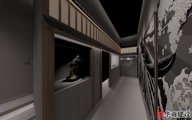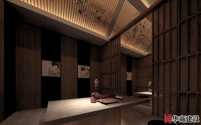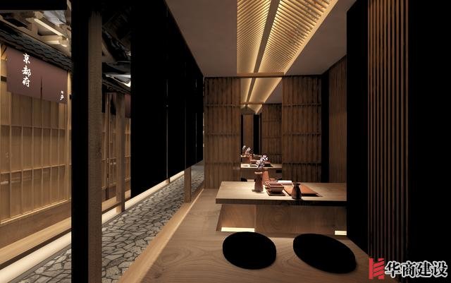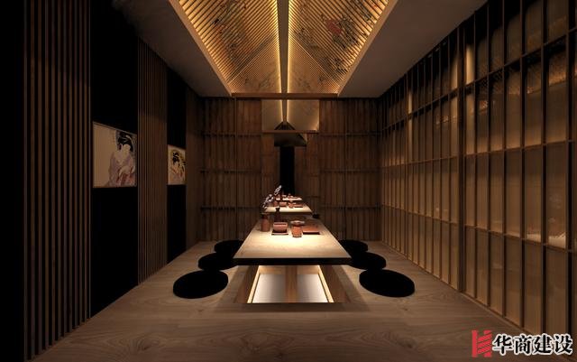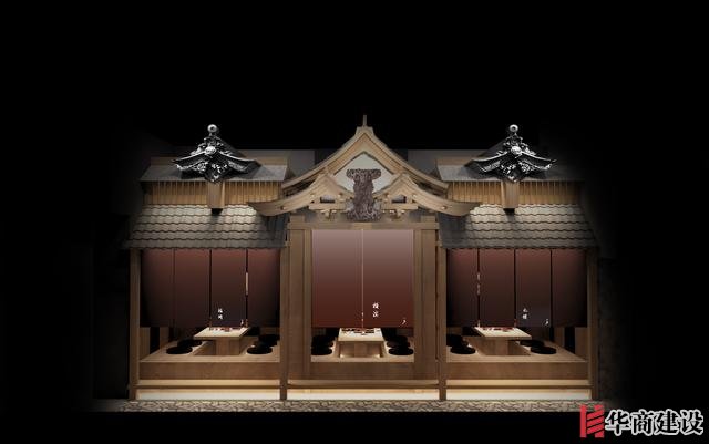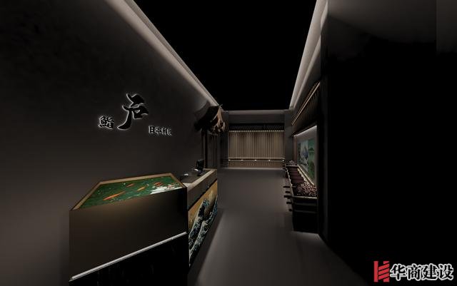 本案在設計中利用該店狹長的特點將日本建筑理念融入餐廳空間設計,創(chuàng)作出日本胡同的延伸感。整體設計以日本原生文化為基調,在空間裝飾上以木制材料為主,配以青石、屋檐、壁畫、雕塑營造出濃郁日本文化和古樸自然之美。而屋脊端頭鬼瓦的裝飾看似不經意,卻最能襯托出日式“精致”之感,在餐廳入口處設置流動氣息的水池,代表著靜中有動的生命力,與整體沉穩(wěn)內斂的基調形成對比。