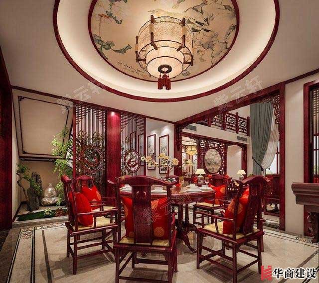 現(xiàn)代中式餐廳裝修效果圖,餐廳氣質(zhì)偏向幽美靜謐,藻井設(shè)計雅致有古韻,角落的一簇青綠帶來了幾許清新,在這樣優(yōu)雅的環(huán)境中度過一日三餐,也是一件雅事。