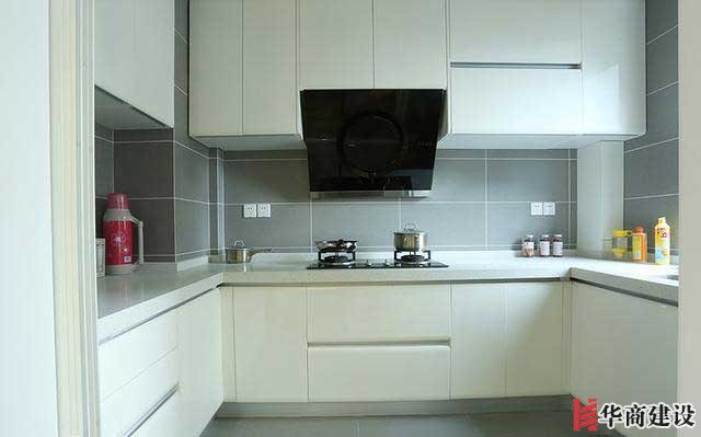 廚房是灰白配色,U字型的整體櫥柜搭配灰色的墻磚和地磚,這其實也就是北歐風(fēng)格的一種代表性色調(diào)了。