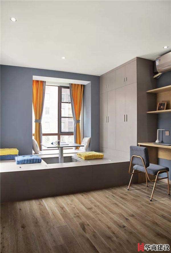 多功能房,木色地面與簡(jiǎn)潔無(wú)主燈頂面,木作榻榻米連接置頂儲(chǔ)物柜,升降桌與書桌的加入增添機(jī)能。