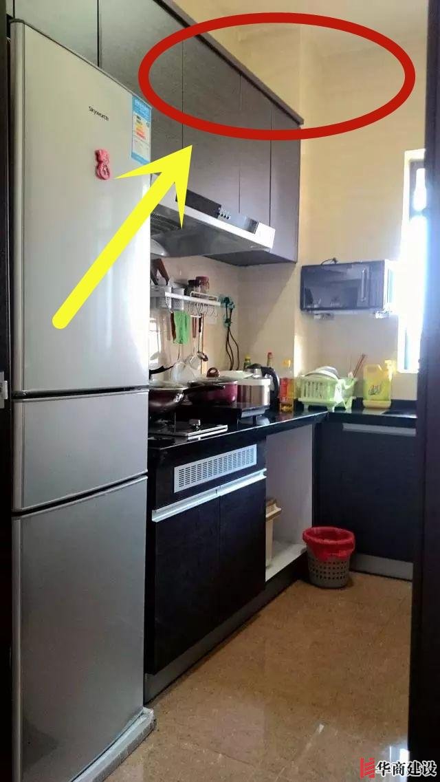 3、櫥柜上頭沒(méi)做到頂,導(dǎo)致空出一大片空白地方,打掃的時(shí)候又是搬梯子又是洗抹布真的心累!要是不去打掃,上面就是蟑螂的基地!光看著都覺(jué)得頭疼!