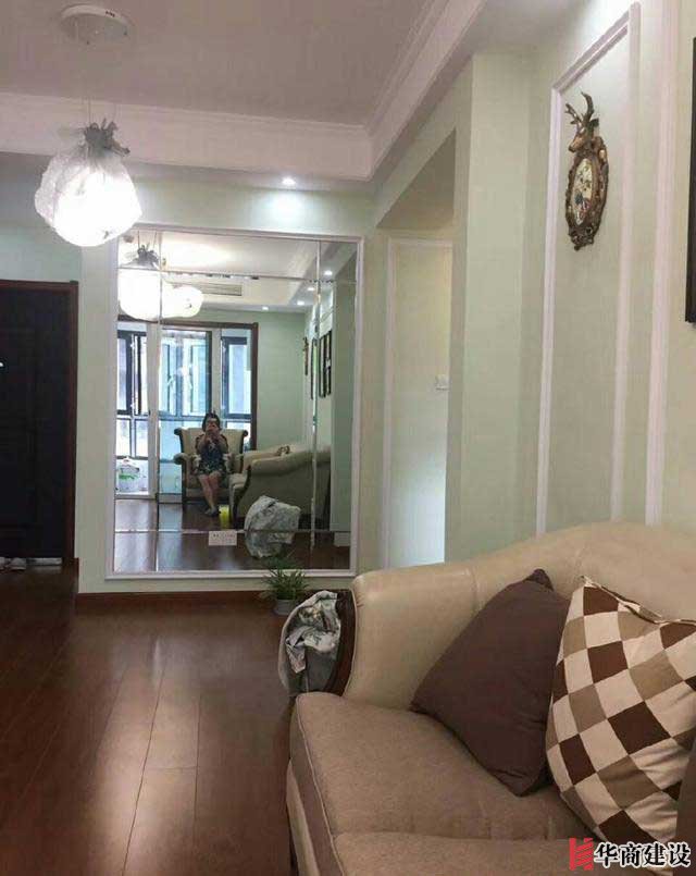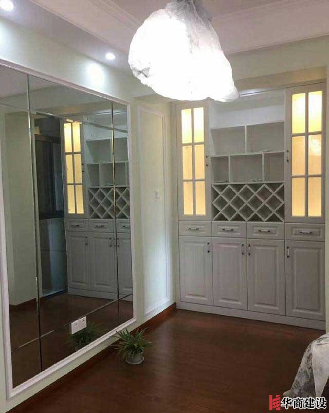 這邊是餐廳,做了一個(gè)酒柜,顯得特別大氣,而且還可以提供非常充足的收納空間,也很大氣。做了鏡子背景墻,通過鏡子的反射,顯得室內(nèi)空間比較寬敞,沒有那么擁擠的感覺。餐桌我們打算買方形的。頂面吊燈已經(jīng)保護(hù)著,這樣子就不會(huì)擠壓灰塵啦。