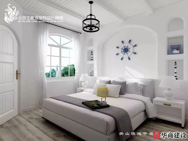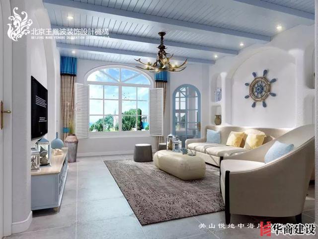 客廳背景墻上船錨裝飾與整體空間相得益彰,仿佛置身藍(lán)色海洋